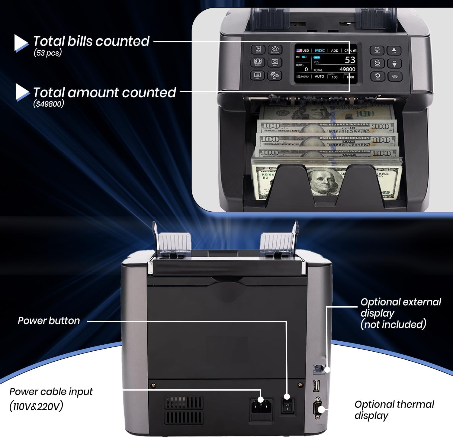 • Velocidad de conteo configurable: hasta 1000 billetes/minuto